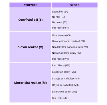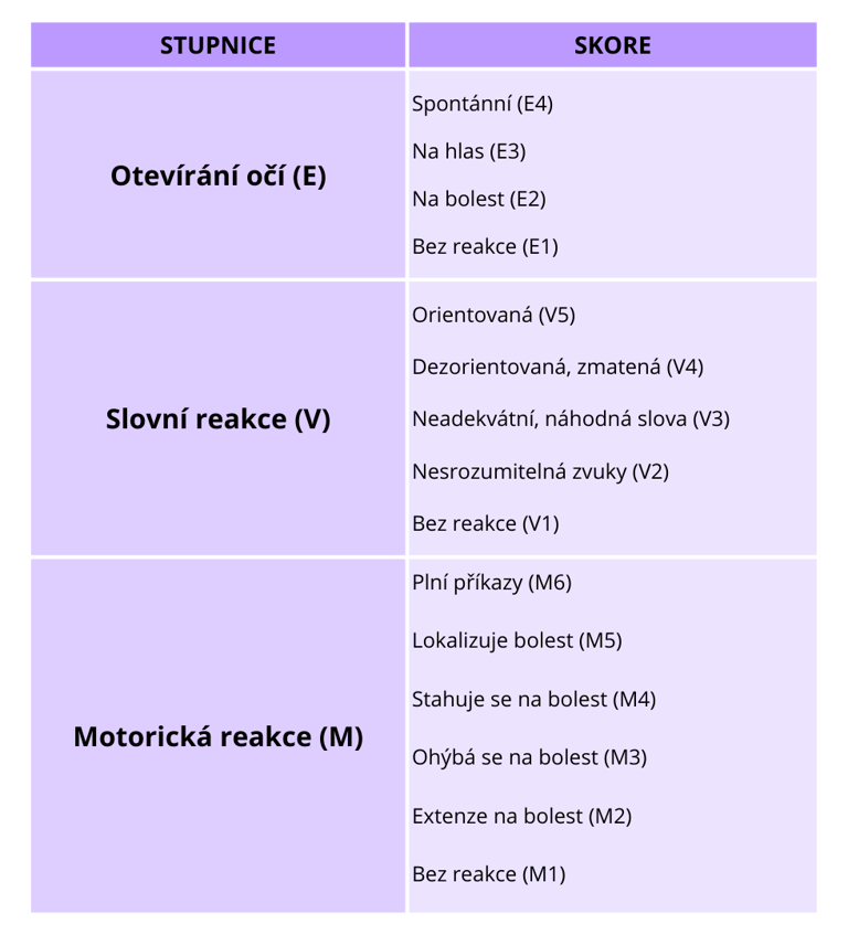 Glasgow Coma Scale (GCS) je neurologický hodnotící nástroj používaný k posouzení úrovně vědomí u pacientů, zejména po úrazech hlavy. Stupnice se skládá ze tří částí: otevírání očí, slovní reakce a motorické reakce. Každá část má určité skóre, které se sčítá, a výsledné skóre určuje závažnost stavu pacienta. Zde je přehled GCS: